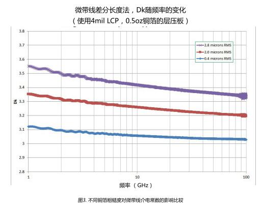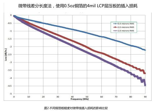 在波導(dǎo)中,導(dǎo)體的表面粗糙度對(duì)導(dǎo)體損耗有著顯著的影響,這一點(diǎn)在微波工程的早期就已經(jīng)被人們所熟知。1949年,S.P.Morgan(參考文獻(xiàn)1)發(fā)表的數(shù)值模擬結(jié)果表明導(dǎo)體表面粗糙度可導(dǎo)致導(dǎo)體損耗成倍增加。 Hammerstad和 Jensen(參考文獻(xiàn)2)將 Morgan的模型和數(shù)據(jù)與微帶設(shè)計(jì)方法結(jié)合起來。Hαυ的模型成為計(jì)算表面粗糙度對(duì)導(dǎo)體損耗影響的“教科書″(參考文獻(xiàn)3)式的方法。隨著使用更髙頻率和更薄層壓板,硏究發(fā)現(xiàn)Hα模型明顯低估了表面粗糙度對(duì)導(dǎo)體損耗的影響(參考文獻(xiàn)5,6)Hal- Huray"模型(參考文獻(xiàn)4)是從“第一原則”分析發(fā)展而來,最近已經(jīng)被商業(yè)仿真設(shè)計(jì)軟件采用。根據(jù)我們的經(jīng)驗(yàn),通過適當(dāng)調(diào)整輸入?yún)?shù),“Ha‖l- Huray”模型可以更準(zhǔn)確預(yù)測(cè)不同層壓板厚度和頻率范圍內(nèi)的導(dǎo)體損耗?!?/span>Hal- Huray”模型已被納入羅杰斯公司的阻抗和損耗計(jì)算器軟件(MwM)中。我們目前正致力于開發(fā)最好的“HalHuray”輸入?yún)?shù)來模擬羅杰斯的層壓板性能。請(qǐng)?jiān)诰€査看羅杰斯官網(wǎng)的攴持中心或聯(lián)系您所在地區(qū)的羅杰斯銷售工程師來獲取最新信息。羅杰斯對(duì)銅箔的硏究(參考文獻(xiàn)5,6,7)還表眀,銅箔粗糙度會(huì)影響傳播常數(shù),比較粗糙的銅箔表面會(huì)導(dǎo)致有效介電常數(shù)明顯增加。圖3顯示了在4mi液晶聚合物層壓板(LCP)上,分別使用Sq值在0.4um到28um的銅箔,其50歐姆傳輸線的介電常數(shù)情況。可以看到具有最大粗糙度銅箔的電路的Dk增加近10‰%。在“ Hall-huray"模型中沒有考慮到銅箔粗糙程度對(duì)相位響應(yīng)的影響銅箔表面粗糙度對(duì)插入損耗的影響非常明顯(如圖2)。在90GHz下,由4mi厚的液晶聚合物(LCP)層壓板、壓延銅箔(藍(lán)線)制成的50歐姆傳輸線的插入損耗汋2.2dB/iηch,該性能幾乎與完全光滑的銅箈導(dǎo)體的模型完全相同。在相同的基板上采用標(biāo)準(zhǔn)電解銅箔,其Sq值為2.oum,插入損耗增大為3.7dB/inch。圖4顯示了圖2中所示數(shù)據(jù)的導(dǎo)體的銅箔表面粗糙度的形態(tài)。