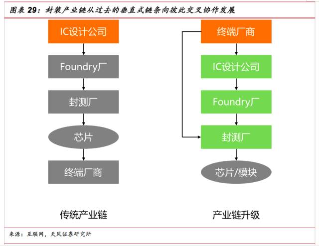 從產(chǎn)業(yè)鏈的變革、產(chǎn)業(yè)格局的變化來看,今后電子產(chǎn)業(yè)鏈將不再只是傳統(tǒng)的垂直式鏈條:終端設(shè)備廠商——IC設(shè)計公司——封測廠商、Foundry廠、IP設(shè)計公司,產(chǎn)品的設(shè)計將同時調(diào)動封裝廠商、基板廠商、材料廠、IC設(shè)計公司、系統(tǒng)廠商、Foundry廠、器件廠商(如TDK、村田)、存儲大廠(如三星)等彼此交叉協(xié)作,共同實現(xiàn)產(chǎn)業(yè)升級。未來系統(tǒng)將帶動封裝業(yè)進(jìn)一步發(fā)展,反之高端封裝也將推動系統(tǒng)終端繁榮。未來系統(tǒng)廠商與封裝廠的直接對接將會越來越多,而IC設(shè)計公司則將可能向IP設(shè)計或者直接出售晶圓兩個方向去發(fā)展。