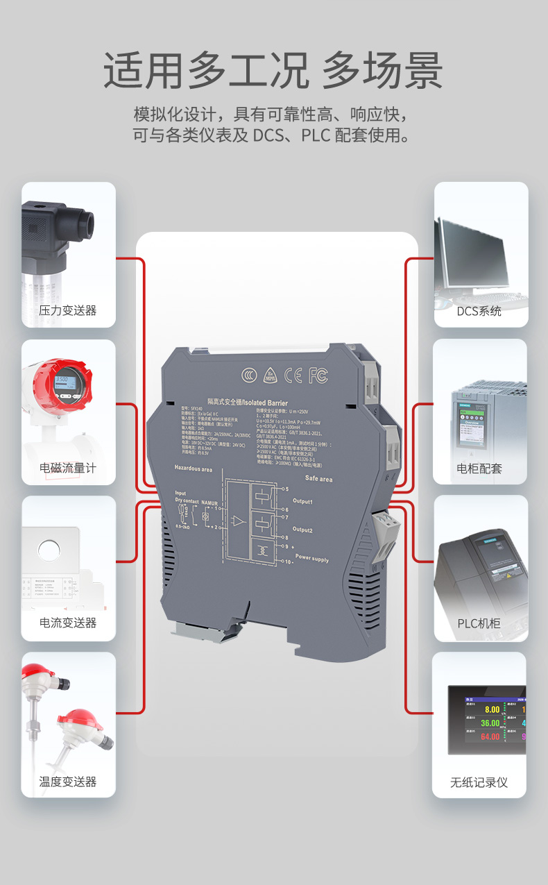 本產(chǎn)品向危險(xiǎn)區(qū)的變送器提供隔離的工作電源,同時(shí)檢測回路中的電流,經(jīng)隔離變送輸出電流或電壓信號到安全區(qū),支持HART信號雙向傳輸,同時(shí)輸入端、輸出端及電源端三端隔離,具有響應(yīng)快、功耗低、溫度特性好等優(yōu)點(diǎn)。