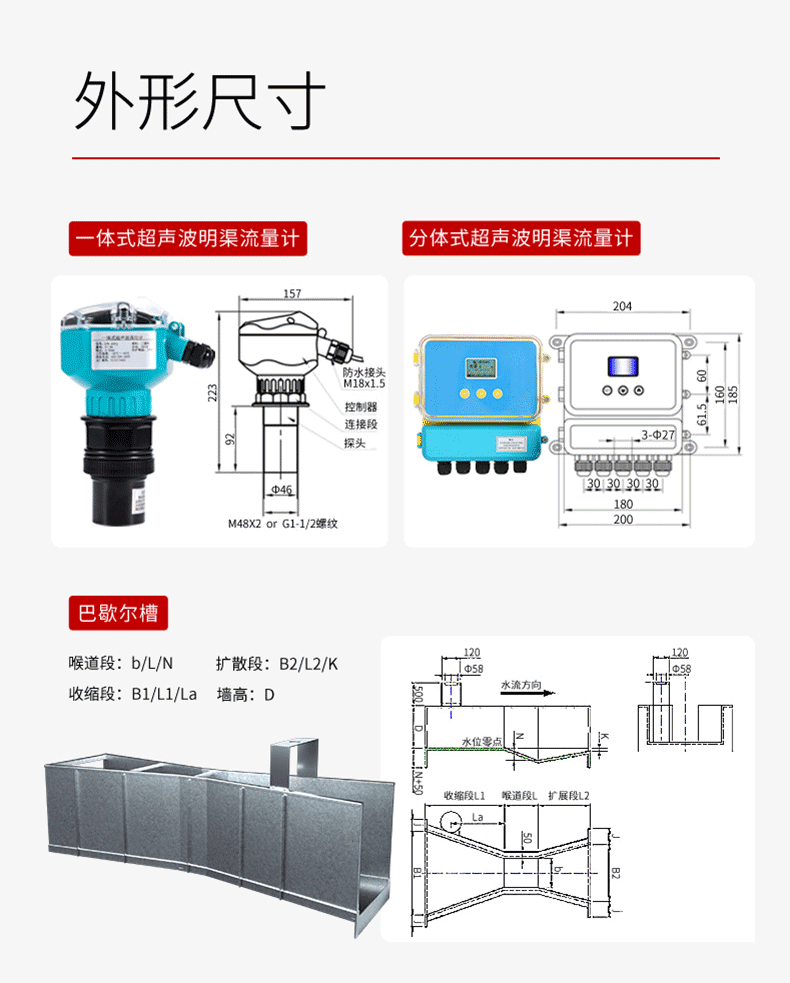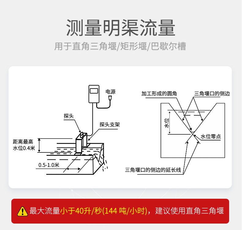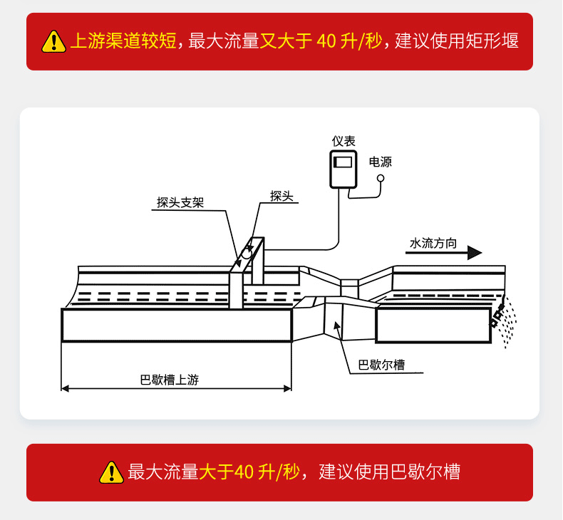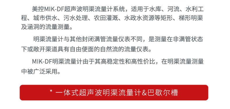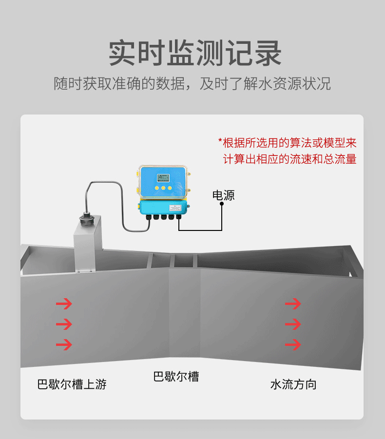 明渠流量計(jì)以流速-水位運(yùn)算法為基礎(chǔ),并采用了先進(jìn)的流速測量儀和水位測量儀,從而確保測速和運(yùn)算的準(zhǔn)確性的一種新型智能化流量系統(tǒng),根據(jù)渠道的寬度和測量精度的要求,采用單探頭法或多探頭法明渠測流的數(shù)學(xué)模型。明渠流量計(jì)是非接觸測量,能在較惡劣的環(huán)境中應(yīng)用。明渠流量計(jì)應(yīng)用場所有城市供水引水渠、火電廠冷卻引水河排水渠、污水治理流入和排放渠、工況企業(yè)廢水排放以及水利工程和農(nóng)業(yè)灌溉用渠道等。(我們不提供配套的巴歇爾槽)