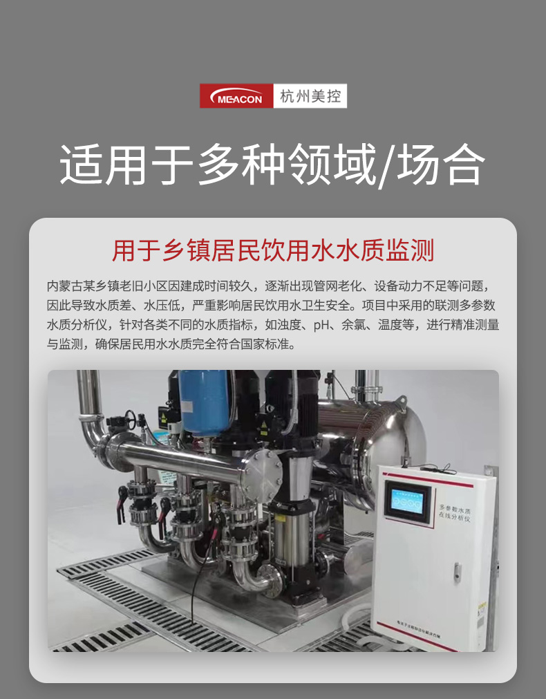 多參數水質在線分析儀是本公司自主研發(fā)制造的新一代飲用水水質 監(jiān)測設備,該設備可廣泛用于城市或村鎮(zhèn)自來水廠、自來水輸水管網、自來水二次供水、用戶末梢、室內游泳池、大型凈水設備和直飲水等水 質在線監(jiān)測,是水廠生產過程控制、水利水務管理、衛(wèi)生監(jiān)督等領域必不可少的在線分析設備。本公司掌握該產品的核心傳感器技術,擁有該產品的核心知識產權,并提供該產品 OEM 定制服務。多參數水質在線分析儀分為標準版和定制版,標準版監(jiān)測參數包括 濁度、余氯二氧化氯、pH、溫度。定制版根據客戶需要,增減監(jiān)測參數。定制版增加參數包括電導率/TDS、溶解氧、ORP等。同時,定制版可以根據需要,定制儀器外形、標志、系統(tǒng)名稱等項目。