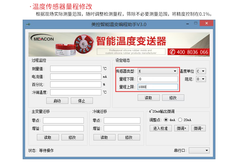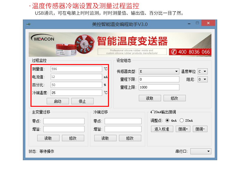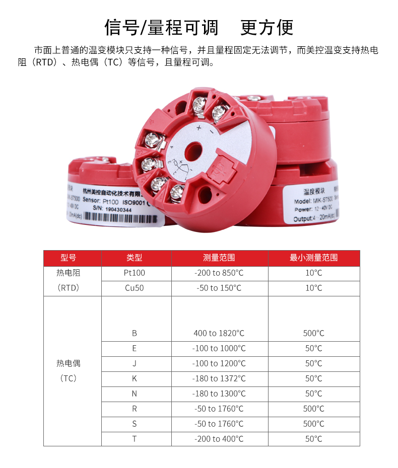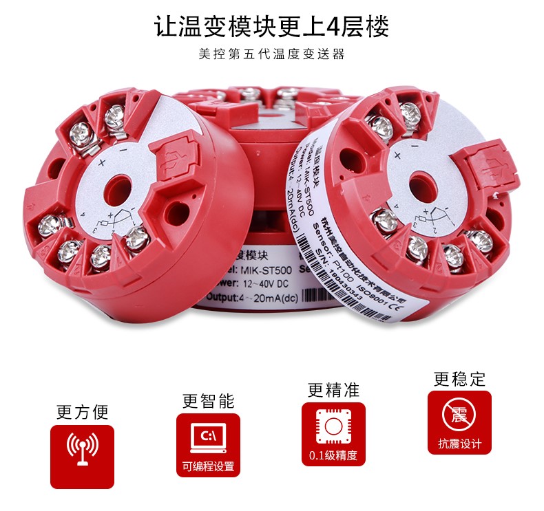 MIK-ST500作為新一代的溫度變送樞紐,他的兼容性和精度遠(yuǎn)遠(yuǎn)領(lǐng)先同類溫濕度變送器,通過V6編程線連接電腦USB端口,可由電腦監(jiān)控數(shù)據(jù)并調(diào)整對接的傳感器類型和量程上下限,其所提供的全面單點測量解決方案,包括了PT100,CU50及各類熱電偶。頂部安裝式智能溫度變送器,用于熱電阻(RTD)、熱電偶(TC)、電阻(Ω)、電壓(mv)信號輸入,將各種輸入信號轉(zhuǎn)換為4-20MA輸出信號。